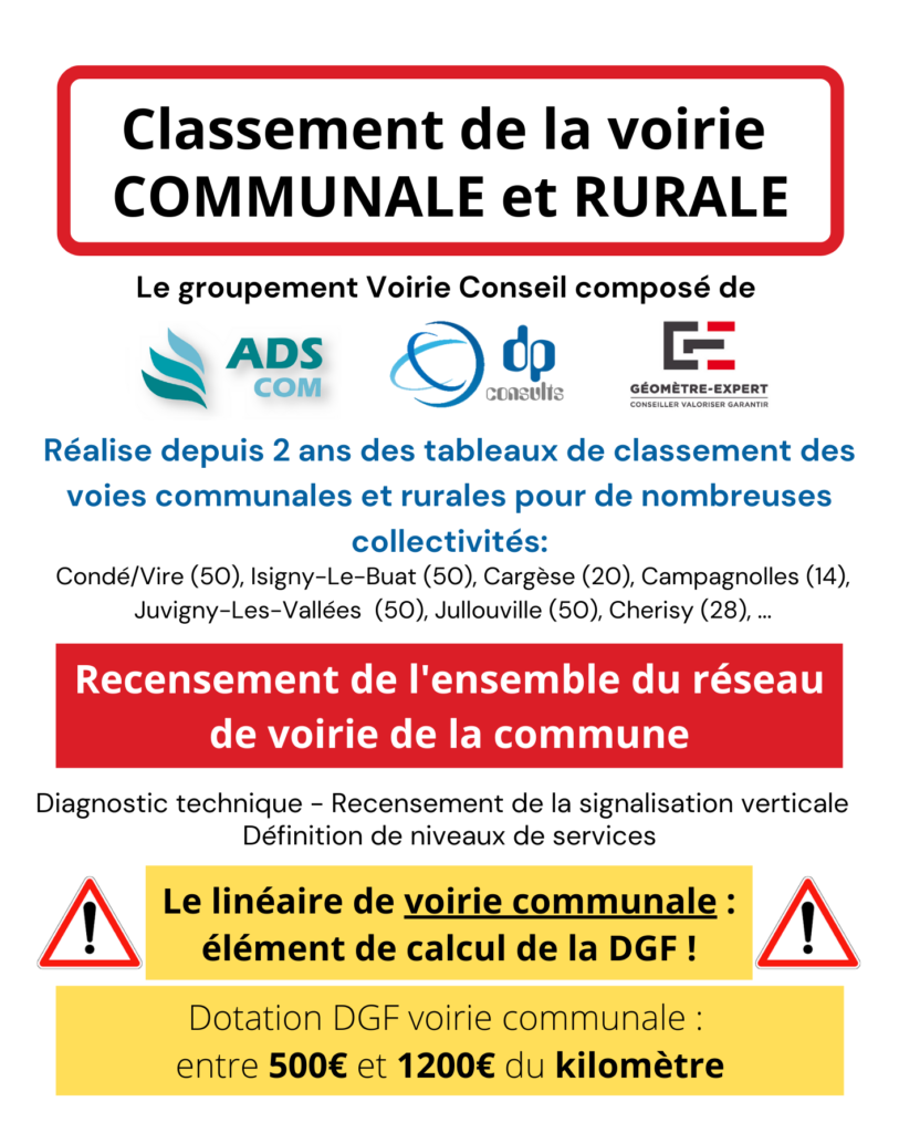 Face à une forte demande et dans le cadre du développement de l’activité de conseil et d’instruction pour le compte des collectivités, nous réalisons depuis 2 ans des tableaux de classement des voies communales et rurales pour de nombreuses collectivités.